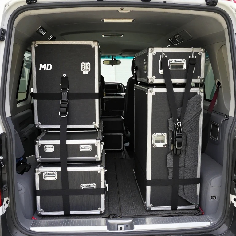 - 重いもの(アンプ、ドラムなど)を下に、軽いもの(ギターケースなど)を上に。