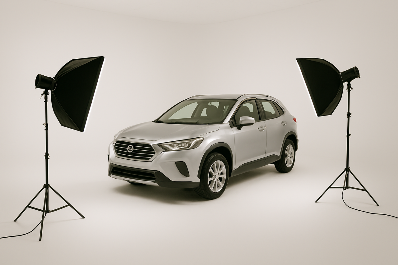影コントロールでつまずきやすいのは、光の強さが偏ること。白ホリの広さを活かしてライトを均等配置しましょう。アール壁が影をぼかしてくれますが、被写体が大きすぎると調整が必要。車サイズなら問題ありません。